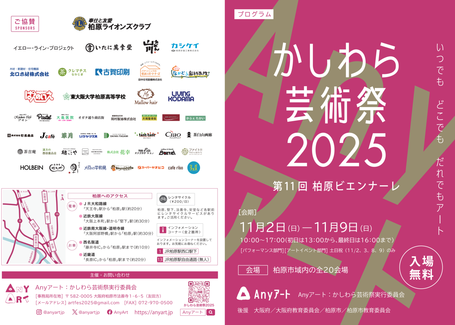 かしわら芸術祭2025は、「いつでも どこでも だれでもアート」を基本理念に、日常生活の中にアートを生かし、地域の魅力を高めることをビジョンとしたビエンナーレ(2年に1度の芸術祭)です。今回の第11回は下記テーマを掲げ、異なる背景を持つ人々が、アート作品をきっかけに出会い、対話を生み出し、共鳴しあうことで、これからの社会に新たな可能性と価値を創出する場になることを目指します。作品の形式・様式やテーマの捉え方は自由に幅広く募集します。参加資格の制限や審査はありません。皆様の創造力溢れる作品を心よりお待ちしております!